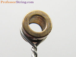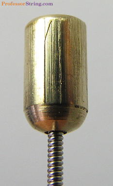 This ball-end is from a string set made in China. It is a low grade brass that allows for ultra low cost strings. Although we found this particular string to have other issues, the twist in the loop is fairly tight and well done. This makes it friendly to bridges with narrow string channels.