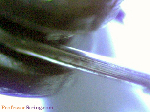 In the figure Loop 1, below shows a brand new string with a fairly loose ball-end loop. This is a string from a company with a very well known brand in the industry. The core string has good uniformity in its shape. In addition, you can see the normal extrusion marks, or lines, from when it was drawn into the proper gauge diameter and hex shape. In Loop 2, the same exact string was installed on a guitar. The guitar had a tailpiece bridge with narrow string channels. As you can see, there were dig marks created on the core string from the Spring Effect. In fact, a small tiny metal burr has developed on the string. The marks are created by the bridge digging into the ball-end loop. This occurs once the string has been tightened to tuning tension. Additional micro-movement by a string being bent or stretched can create deeper marks potentially creating a stress point that can cause the string to eventually break at the loop. Aside from poorly twisted ball-end loops, bridges and tailpieces that have narrow string channels, without good chamfering and port holes, some string brands are notorious for causing the Spring Effect. If you are interested in knowing how to diagnose this problem, and finding the right strings without the potential Spring Effect problem, check out Professor String's new eBook.